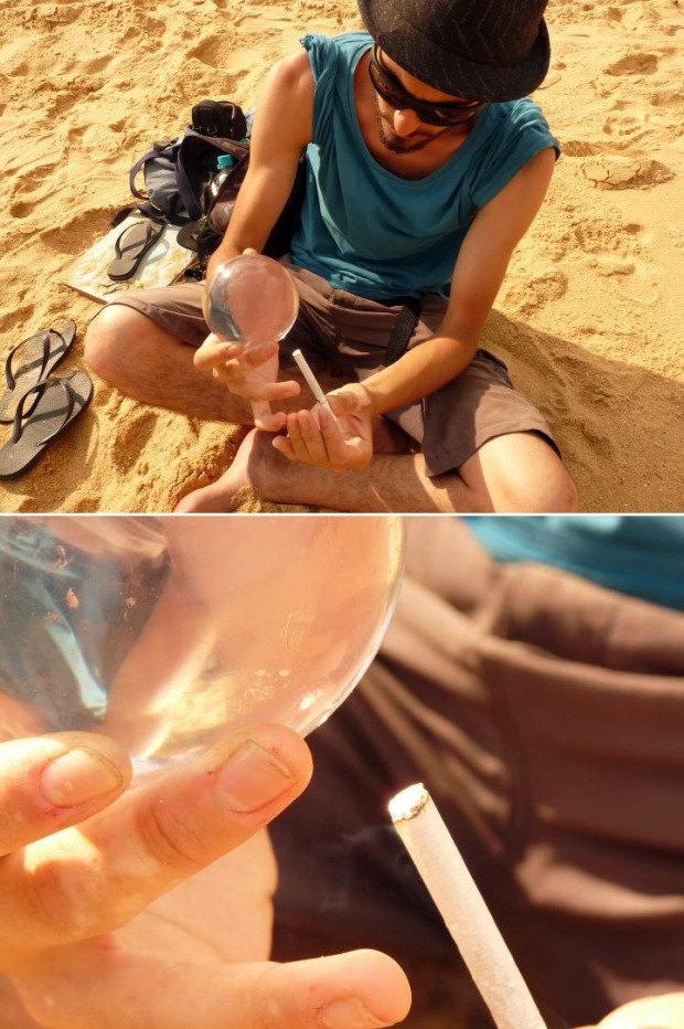 As bolas de contato usadas por malabaristas podem também servir para iniciar fogo. Elas funcionam como uma lupa, condensando a luz do Sol em um ponto de calor. Desse modo, dá pra começar um incêndio, ou apenas acender um cigarro, como é mostrado aqui. Senhores malabaristas que pretender treinar ou fazer números com as bolas de contato, ou contact juggling, à luz do dia: cuidado para não acabarem sofrendo queimaduras.